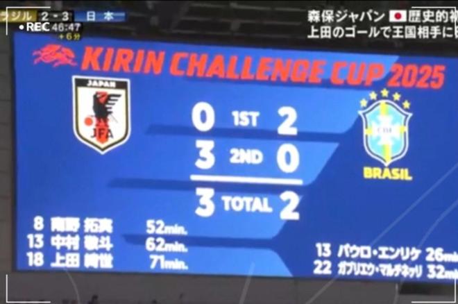 當(dāng)比賽才進(jìn)行到71分鐘的時(shí)候,日本隊(duì)就3-2反超了。此時(shí),日本官方電視臺(tái)提前宣布比賽結(jié)束,打出了“日本隊(duì)首次戰(zhàn)勝五星巴西”的字幕。最終,日本隊(duì)沒(méi)有讓他們的電視臺(tái)被打臉,守住了3-2的勝果。