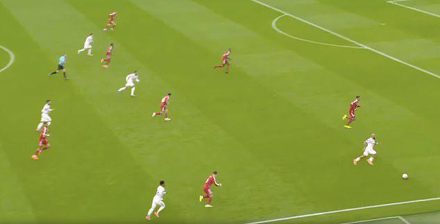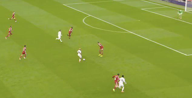 第30分鐘,隨著姆伯莫向前推進,迪亞洛拉開邊路。凱爾凱茲不得不跟隨迪亞洛的跑動以防姆伯莫傳球給他,這使得范戴克陷入一對一的不利局面。